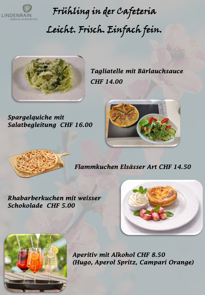 Ab sofort ist die Frühlingskarte in unserer Cafeteria erhältich. Fragen Sie bei unserem Personal nach.