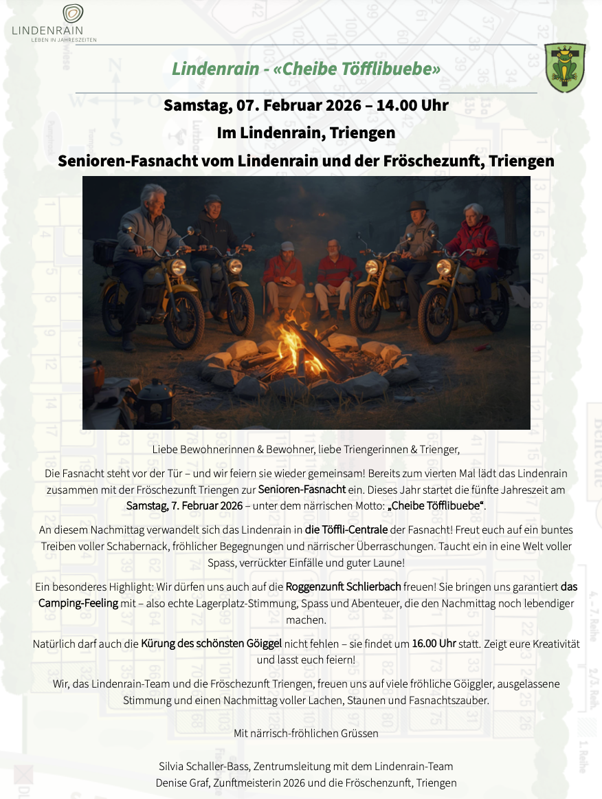 Wir organisieren einen gemeinsamen Morgenspaziergang ins Trienger Dorf, gefolgt von einem feinen Gipfeli und Kaffee in der Lindenrain-Cafeteria.